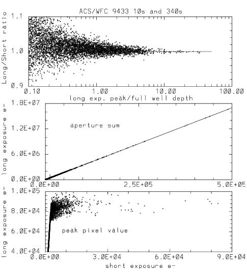 The lower panel shows peak pixel values for many stars observed for 340 seconds (long) and 10 seconds (short) with the WFC. Over the range for which stars are unsaturated in both exposures, there is a linear relation with slope equal to the exposure time ratio. Brighter stars in the long exposure saturate at values near the full well depth. The middle panel shows the same stars using photometry sums from identical apertures in both exposures; stars above the vertical mark near 12,350e¯, on the x-axis, separates stars that are saturated in the long exposure. The upper panel shows the ratio of long to short aperture sums normalized by the relative exposure time plotted against the degree of over-saturation in the central pixel of the long exposure. The lines in the top and middle panels represent the ideal case of perfect linearity in the pixel response. The fact that the data falls on the lines (or are symmetrically scattered about the lines) indicates that the WFC CCDs are close to perfectly linear. The photometric response when summing over saturated pixels that have been bled into remains perfectly linear far beyond the saturation of the central pixel at GAIN = 2.