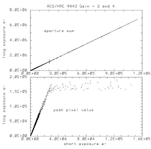 The lower panel shows peak pixel values for many stars observed for 350 seconds (long) and 60 seconds (short) with the HRC. Over the range for which stars are unsaturated in both exposures, there is a linear relation with slope equal to exposure time ratio. Brighter stars in the long exposure saturate at values near the full well depth. The upper panel shows the same stars using photometry sums from identical apertures in both exposures; stars above the vertical mark near 150,000 e¯, on the x-axis, separates stars that are saturated in the long exposure. The photometric response when summing over saturated pixels that have been bled into remains perfectly linear far beyond saturation of the central pixel at GAIN = 4.