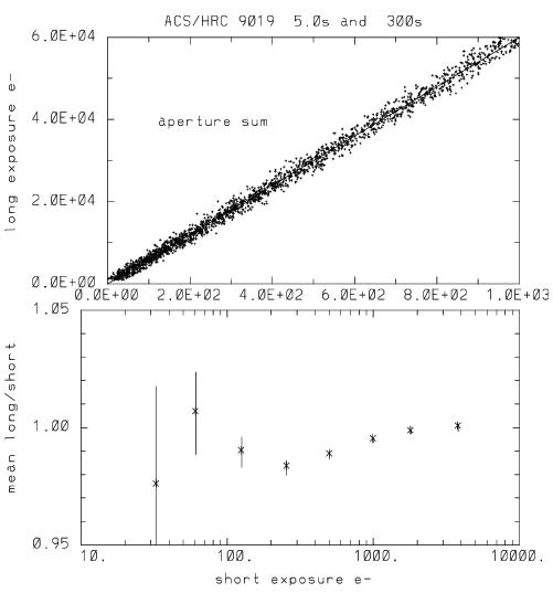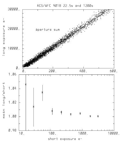 For a more sensitive test the bottom plot shows the results of summing counts over all stars within a defined magnitude range in the short and long exposure cases, separately, before then taking the ratio and normalizing to the relative exposure times.