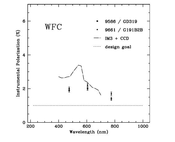 Figure 5.6 shows the same plot for the WFC, which has an instrumental polarization around 2%. Here the IM3 mirror is a proprietary Denton enhanced Silver Coating with an incidence angle of 49°, and the CCD has an incidence angle of 20°. While the lower instrumental polarization of the WFC seems attractive, users are cautioned that the phase retardance effects are not known for the Denton coating, and have some potential to cause serious problems—if sufficiently large, the retardance could produce a large component of elliptical polarization which will be difficult to analyze with the linear polarizers downstream.