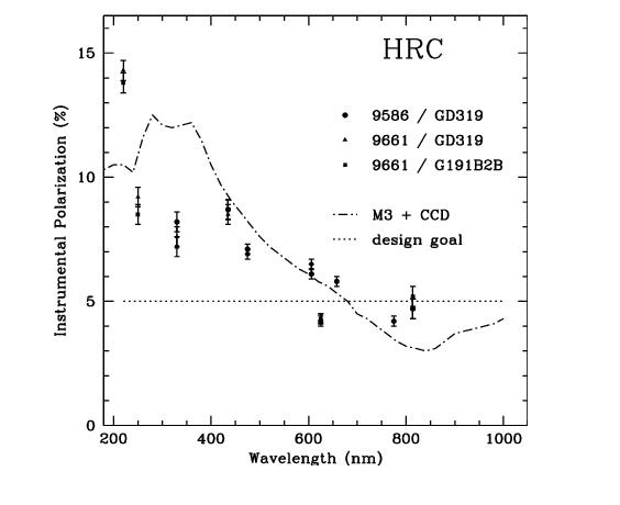The instrumental polarization, defined as the instrument's response to an unpolarized target, provides a simple measure of some of these effects. Figure 5.5 shows the instrumental polarization derived for the HRC through on-orbit observations of unpolarized stars (HST programs 9586 and 9661). The instrumental polarization is approximately 5% at the red end of the spectrum, but rises in the UV to about 14% at the shortest wavelengths. Also shown is a rough model for the effects of the M3 mirror together with a very crude model of the CCD. The mirror is aluminum with a 606 Å thick overcoat of Magnesium Fluoride and has an incidence angle of 47°. Since details of the CCD are proprietary, it has been simply modeled as Silicon at an incidence angle of 31°; no doubt this is a serious over-simplification.