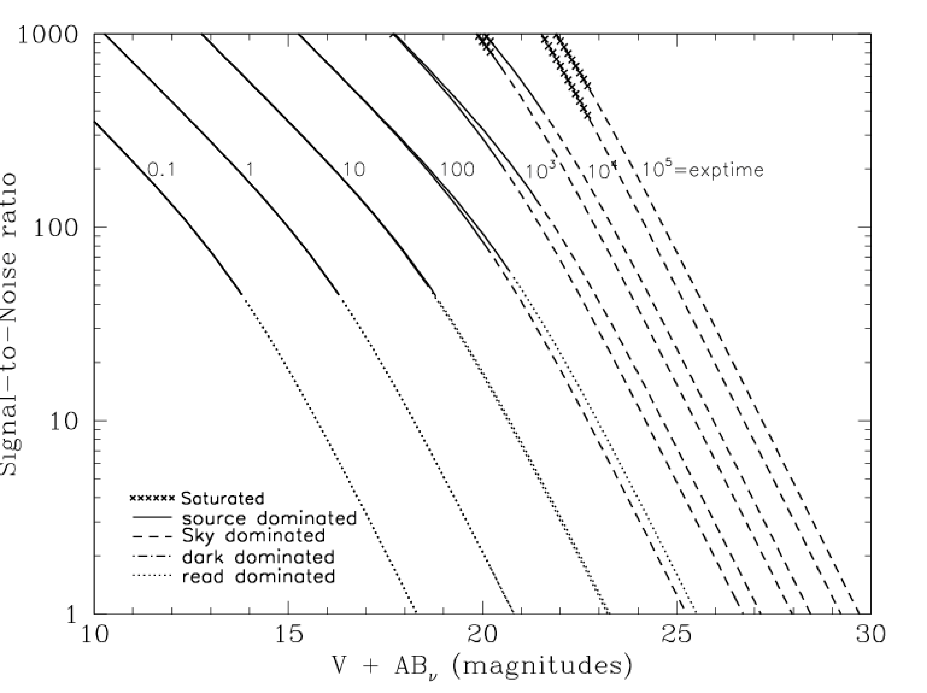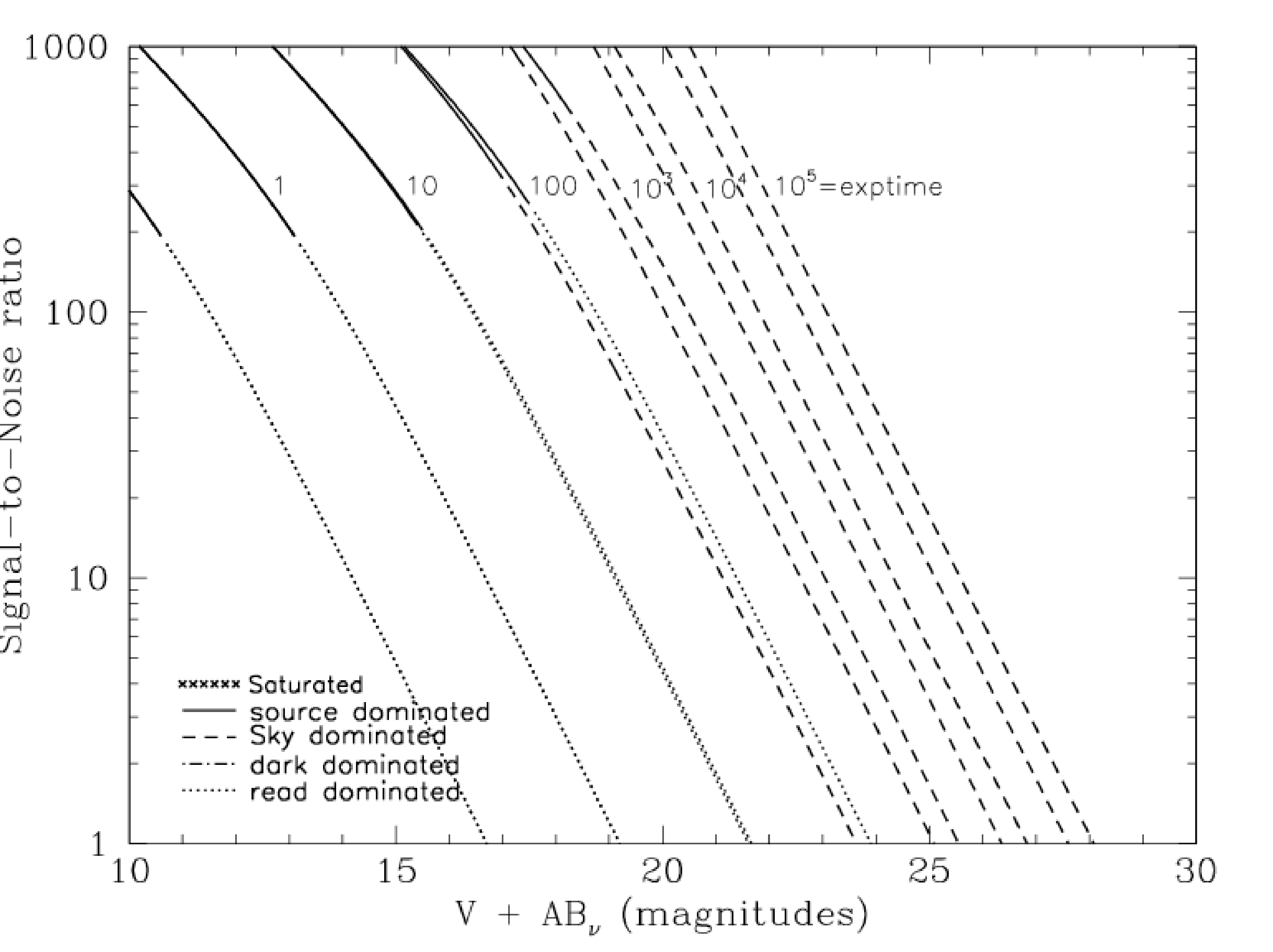 Figure 10.59: Point source S/N vs. V+ABν for the HRC/F475W filter. Top curves are for low sky; bottom curves are for average sky.
