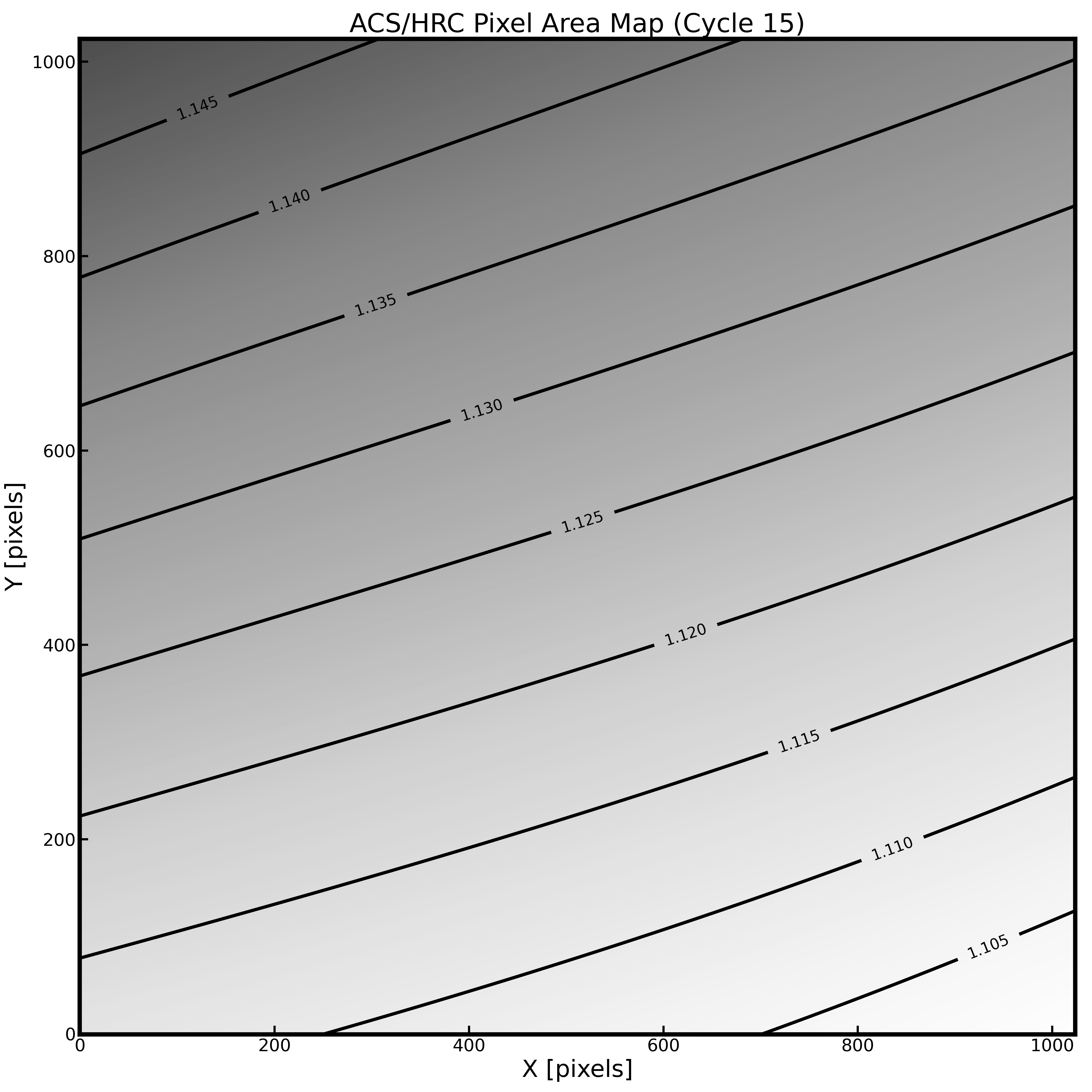As in the case for the WFC, geometric distortion affects not only the astrometry but also the photometry, and a correction for the pixel area is required in order to restore the proper total counts of the target. The PAM generated from Cycle 15 is shown as a contour plot in Figure 10.114. The maximum deviation from the central value is about 3%. Because the PAM is normalized to square pixels of 0.025 arcsecond on a side rather than an area equal to that of the central HRC pixel, the PAM ranges from about 1.1 to 1.15. See the Pixel Area Maps page of the ACS website to access the static HRC PAM file.