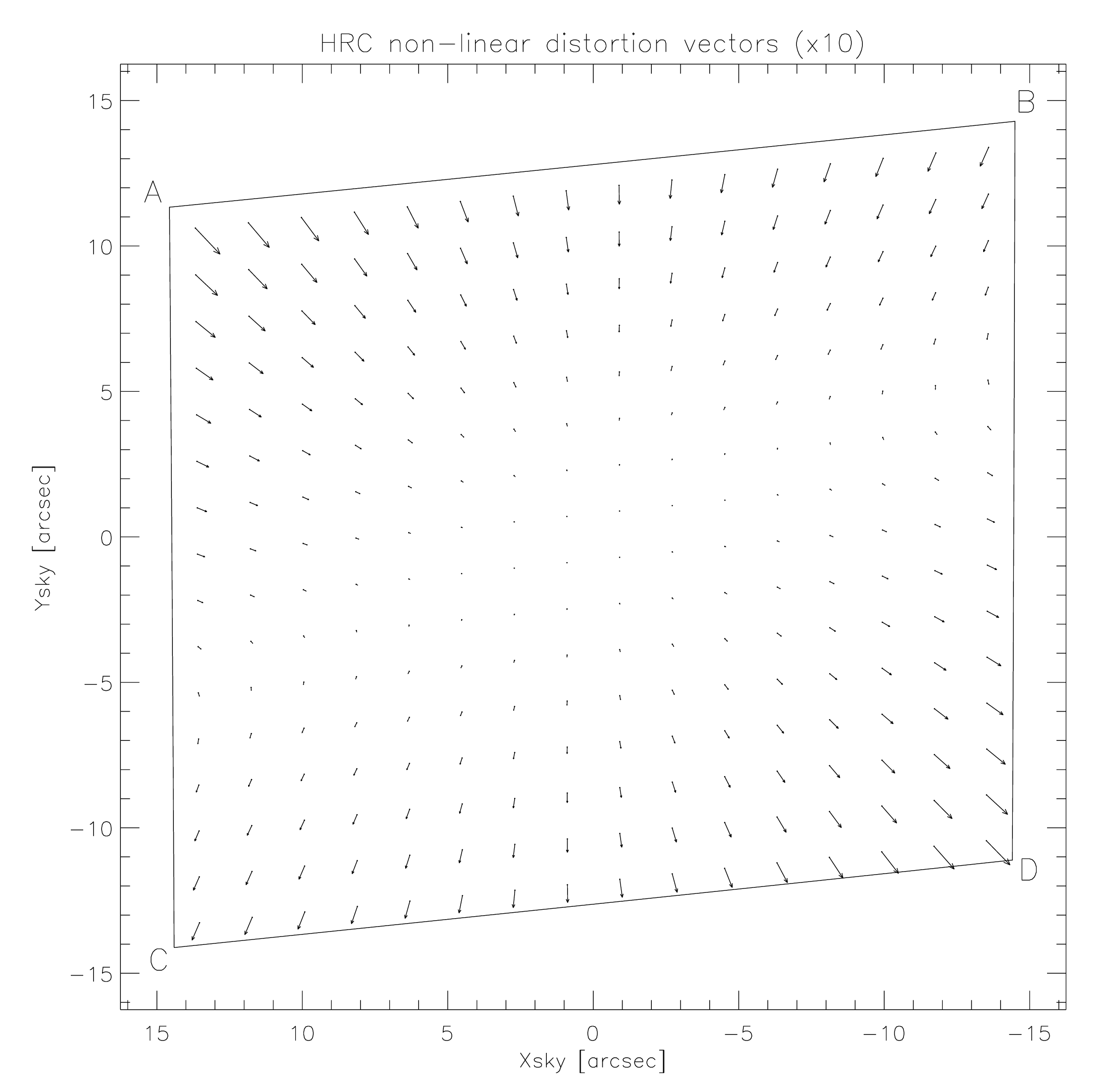 The High Resolution Channel has its edges aligned approximately along the V2 and V3 axes. In this case, the center of the aperture lies on a line passing through the V2-V3 origin and making an angle of 22° with the V3 axis. The diagonal of the aperture does not correspond to a radius of the HST field of view, so the distortion has no particular symmetry with respect to the detector axes. The focal plane of HRC is also 25° away from the plane normal to the light path, hence the scales along the axes differ by 14%. The full field of view of the HRC is less than 30 arcseconds, therefore the scale variation over the field is much less than for the WFC, about 1%. At the center, the X and Y scales are 0.0284 and 0.0248 arcsecond/pixel respectively. The average scales across the middle of the detector are 0.02842 and 0.02485 arcsecond/pixel, making the X and Y widths 29.1 and 25.4 arcseconds. The slightly non-square projected aperture shape is evident in Figure 7.8. The angle between the X and Y axes on the sky is 84.2°. The geometric distortion map for HRC is given in Figure 10.113, where the residuals from the non-linearity are scaled by a factor of 10, with residuals as large as 0.14 arcseconds or 4.9 pixels.