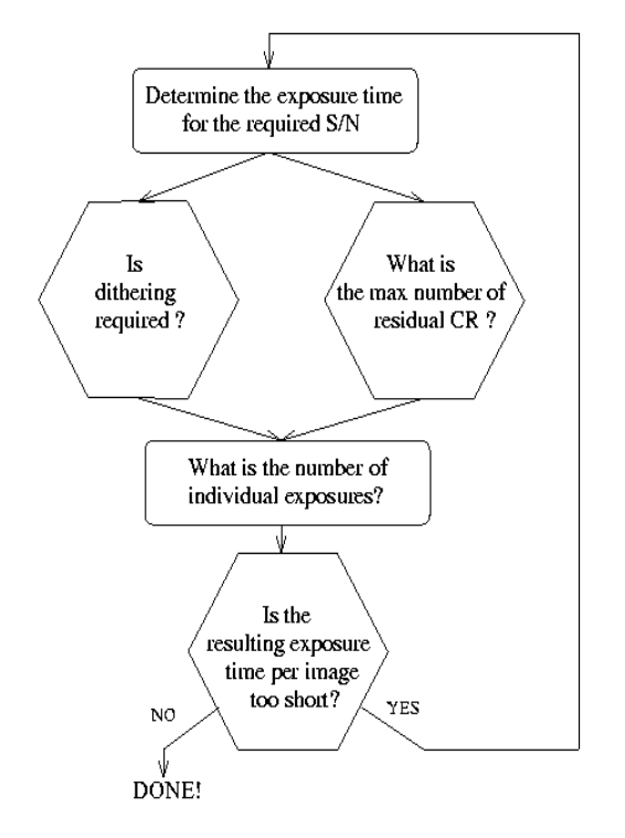 Broadband and grism WFC exposures longer than about 300 seconds are usually background limited with measured backgrounds >20e– (though not always, see ACS ISR 2022-01 for more details on individual filters), while medium- and narrow-band images are readnoise limited for all practical exposure times. Thus, the optimal number of sub-exposures is a result of a trade-off between completeness of the unstable hot pixel elimination, CR-rejection, final image quality, and optimal S/N. A schematic flow chart of this trade-off is given in Figure 7.2. The main steps in this, possibly iterative, process are the following: