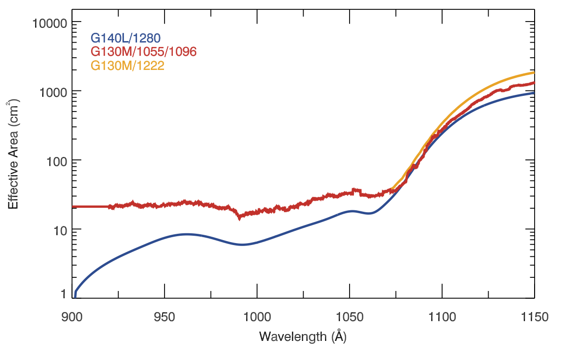 Effective area (cm2) 950 Å (FUV) 1300 Å (FUV) 2500 Å (NUV) | 20 (G130M) 3000 (M) 1800 (L) | --- 600 (M) 750 (L) | --- 400 (M) 1700 (L) | --- 350 (M) 900 (L) | |
