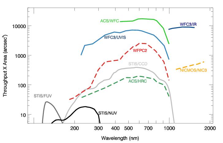 ACS, STIS, and WFC3 cameras are available for Cycle 27. Decisions on which camera to use will be made based on wavelength, field of view, spatial resolution, sensitivity, and the availability of specific spectral elements or observing modes. The figures below provide a set of plots (based on WFC3 SMOV data1 but still valid for current WFC3 operations) comparing throughput and discovery efficiency for the cameras. Please note that COS/NUV is also available for imaging albeit over a very small field of view. For more information please see Chapter 6 in the COS Instrument Handbook.