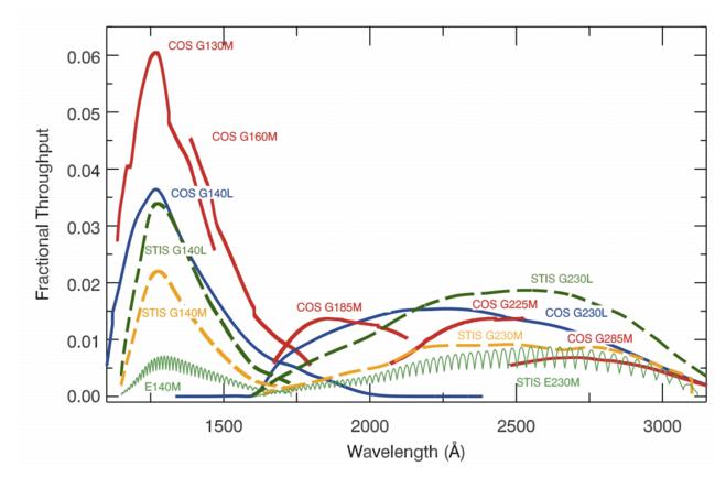 Figure 5. Throughputs for COS and STIS in the FUV and NUV. |