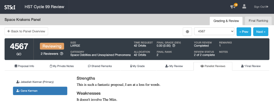 Each proposal is generally assigned both a primary and a secondary reviewer, but ultimately STScI needs a single “final” review for each proposal. Typically the primary reviewer incorporates the secondary reviewer’s comments into their own, and then submits that as the final review. The documentation here describes how to do that.