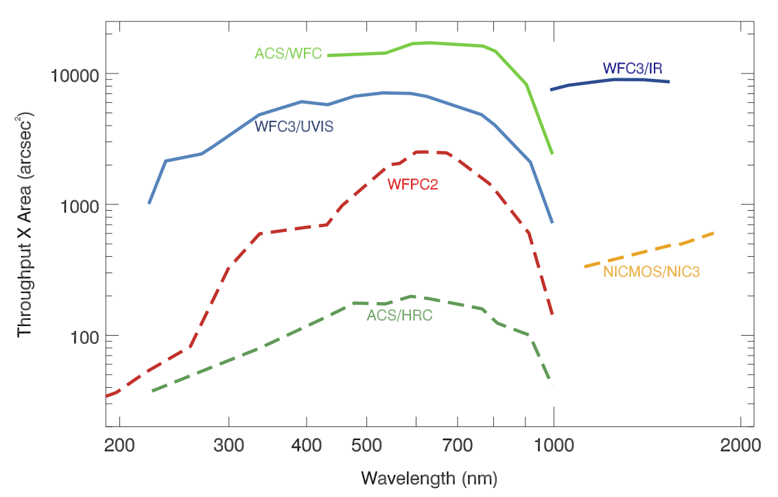 ACS, STIS, and WFC3 cameras are available this cycle. Decisions on which camera to use will be made based on wavelength, field of view, spatial resolution, sensitivity, and the availability of specific spectral elements or observing modes. The figures below provide a set of plots (based on WFC3 SMOV data1 but still valid for current WFC3 operations) comparing throughput and discovery efficiency for the cameras. Please note that COS/NUV is also available for imaging albeit over a very small field of view. For more information please see Chapter 6 in the COS Instrument Handbook.