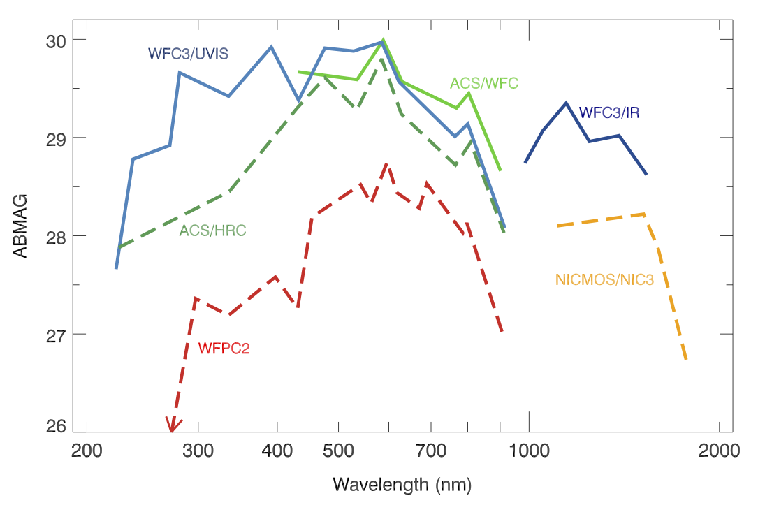 Figure 3. Point-Source Limiting Magnitude Full lines represent instruments that will be offered this cycle for imaging observations. Dashed lines represent instruments that are not available (HRC, NICMOS) and a previously flown instrument (WFPC2). |