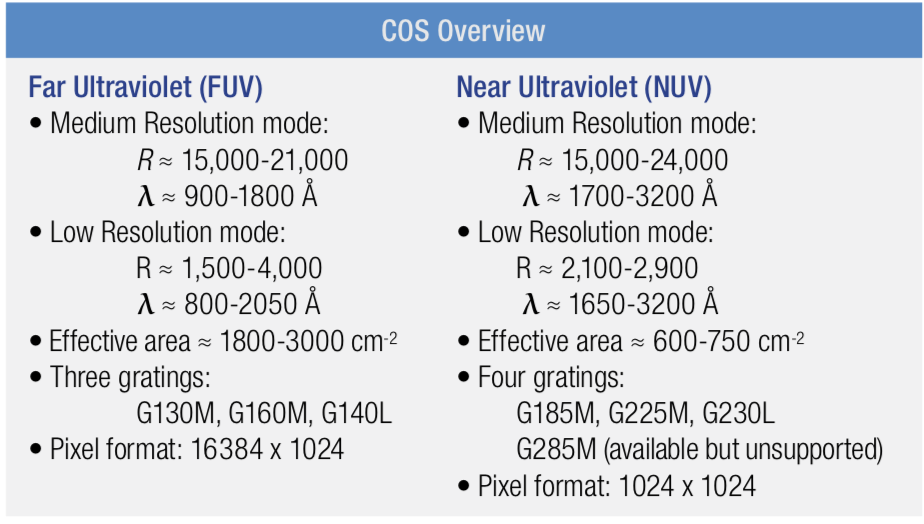 COS works exclusively in the UV and provides low to medium resolution spectroscopy from 800 to 3200 A.