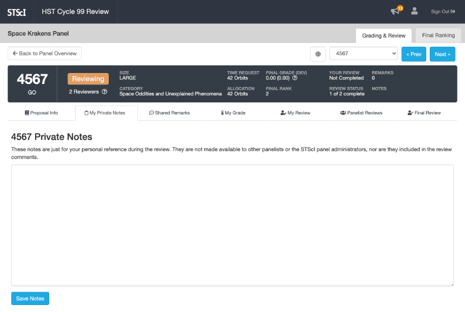SPIRIT allows you to enter private notes on any proposal you are allowed to view, regardless of whether you are assigned as a reviewer or grader. Your private notes are meant for your own personal reference. They are not made available to other panelists or the panel administrators, and they are not included in the final review. (They may, however, be seen incidentally by IT staff at STScI such as database administrators, software engineers, and software testers.)