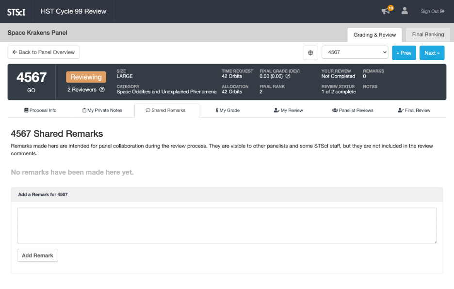 For some types of panels, SPIRIT allows you to enter shared remarks on any proposal you are allowed to view, regardless of whether you are assigned as a reviewer or grader. They are intended for panel collaboration during the review process, so they are visible to other non-conflicted panelists and some STScI staff. Shared remarks are not included in the final review.