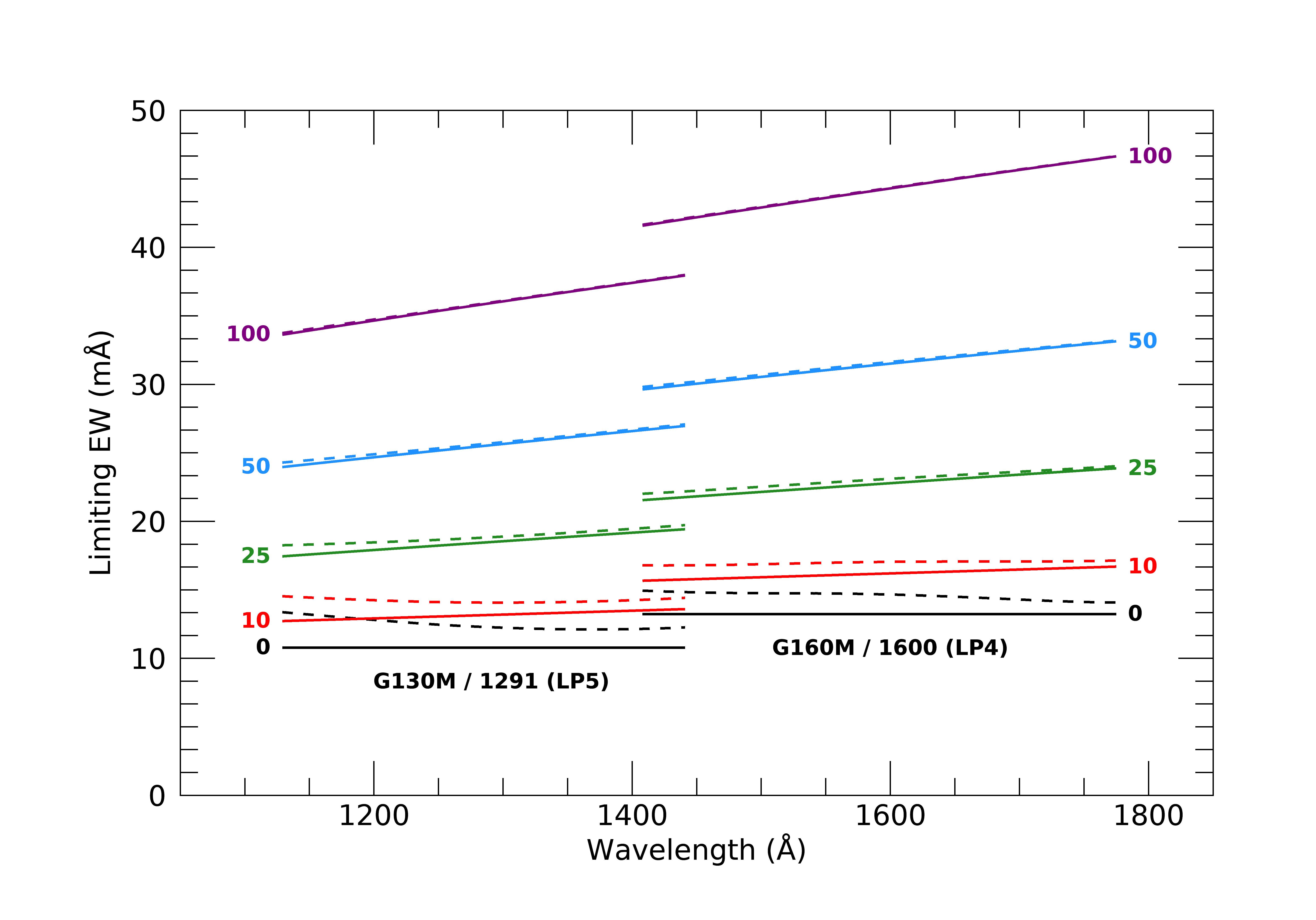 The broad core and extended wings of the COS LSF increase the limiting equivalent width for absorption features in COS spectra. Figure 3.8 shows the limiting equivalent widths as a function of wavelength for a 3σ FUV detection of absorption features at S/N = 10 per pixel at lifetime position 4. A series of Gaussian spectral features with nominal Doppler parameters of b = 0, 10, 25, 50, and 100 km/s have been convolved with both a Gaussian instrumental LSF and the modeled on-orbit COS LSF for the G130M and G160M gratings. The results are similar for the NUV gratings, although the effect of the MFWFEs is more moderate for the long-wavelength G285M grating.