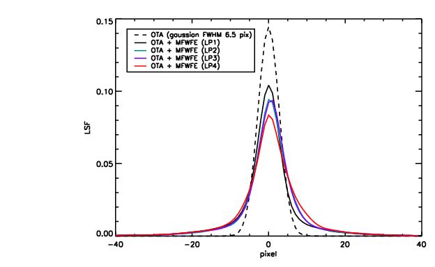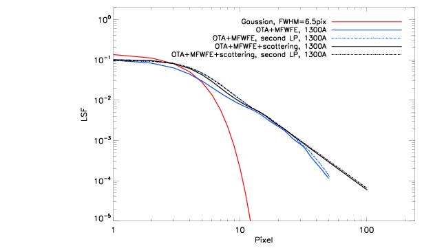 Initial results from an analysis of the on-orbit COS LSF at the original lifetime position are reported by Ghavamian et al. (2009) in COS ISR 2009-01. They find that model LSFs incorporating HST MFWFEs are required to reproduce the absorption features observed in stellar spectra obtained with COS. Figure 3.6 shows model LSFs computed for grating G130M at 1309 Å. The dashed line represents a model incorporating the spherical aberration of the HST OTA. It is well-fit by a Gaussian with FWHM = 6.5 pixels. The solid black line represents a model that includes the MFWFEs at the original lifetime position, while the solid colored lines represent models that include the MFWFEs at subsequent lifetime positions. The model at the original lifetime position has a FWHM of 7.9 pixels, slightly larger than that of the dashed curve, and broad non-Gaussian wings. The models at subsequent lifetime positions have similar FWHM. The non-Gaussian wings can hinder the detection of closely-spaced narrow spectral features. Model LSFs for all of the COS gratings at the original and subsequent lifetime positions are available on the COS website.