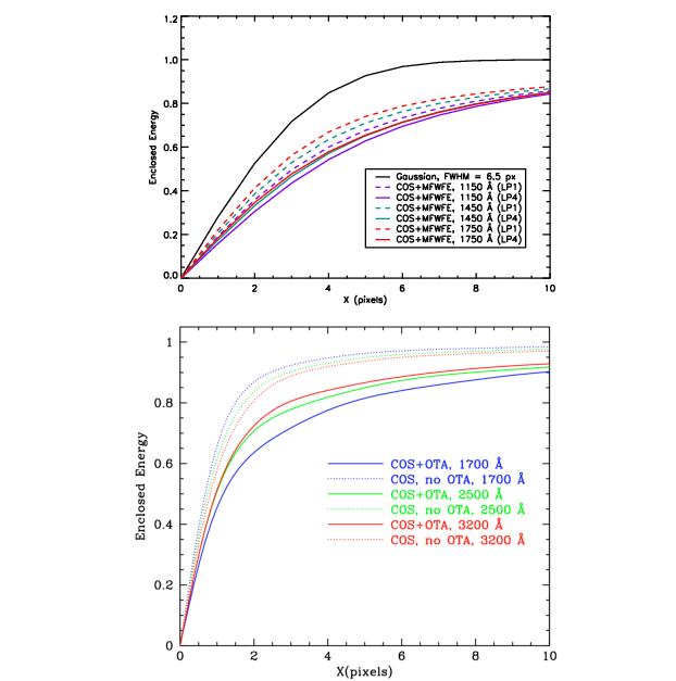 Figure 3.10 shows the fraction of enclosed energy within the LSF, measured from the center of the profile, for both the FUV and NUV channels. The differences between the modeled on-orbit LSFs (MFWFEs included) and the Gaussian LSFs without MFWFEs are apparent in both spectroscopic channels. Though inclusion of the MFWFEs at longer NUV wavelengths widens the FWHM of the on-orbit LSF models only slightly, the wider wings decrease noticeably the spectral purity and the contrast level of the observed spectra.