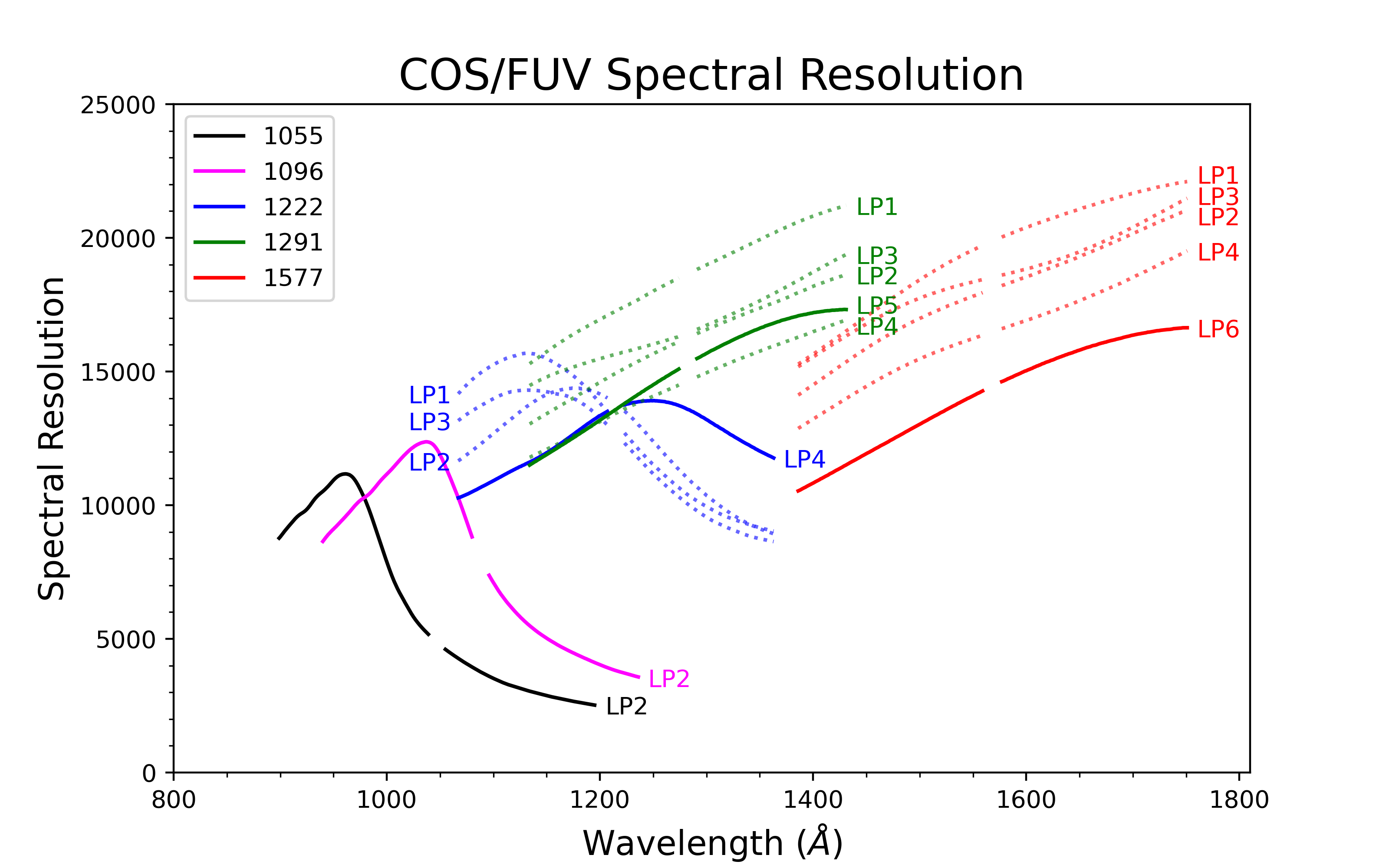 Figure 3.7: Resolving Power of FUV Gratings at select cenwaves, and for all Lifetime Positions (LPs). Solid lines show the current default LP for each cenwave.