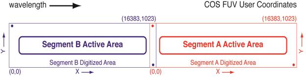 The COS FUV detector is a windowless cross delay line (XDL) device that is similar to the detectors used on the Far Ultraviolet Spectroscopic Explorer (FUSE). The XDL is a photon-counting micro-channel plate (MCP) detector with two independently operable segments (FUVA and FUVB). Each segment has an active area of 85 × 10 mm; they are placed end-to-end and separated by a 9-mm gap. When the locations of detected photons are digitized they are placed into a pair of arrays (one per detector), each 16,384 × 1,024 pixels, though the active area of the detector is considerably smaller. Individual pixels span 6 × 24 μm. The long dimension of the array is in the direction of dispersion; increasing pixel number (the detector’s x axis in user coordinates) corresponds to increasing wavelength. The XDL format is shown schematically in Figure 4.1. Detector parameters are listed in Table 1.2.