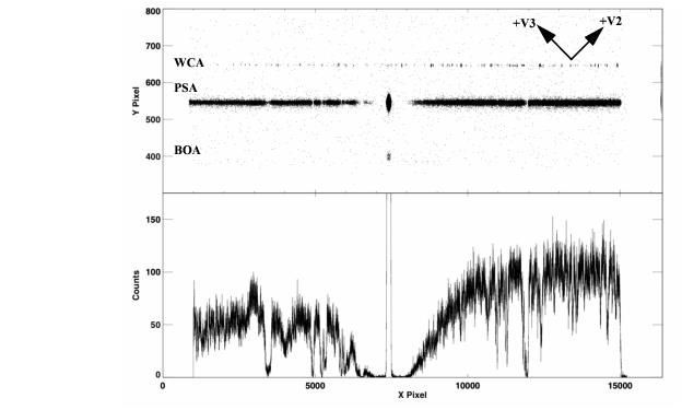 Upper panel: A stellar spectrum obtained with Segment B of the COS FUV detector using the G130M grating at a central wavelength of 1309 Å. (This configuration is not allowed by the COS 2025 policy.) The wavelength calibration (WCA) spectrum is on top, and the stellar spectrum (PSA) is below. Both the PSA and BOA are open to the sky when the COS shutter is open, so Lyman-α airglow through the BOA is also visible below the PSA. The HST +V2 and +V3 axes are over plotted. Note that the size of the active area of the MCP is smaller than the overall digitized area (16,384 × 1,024). Lower panel: the extracted stellar spectrum from the PSA.