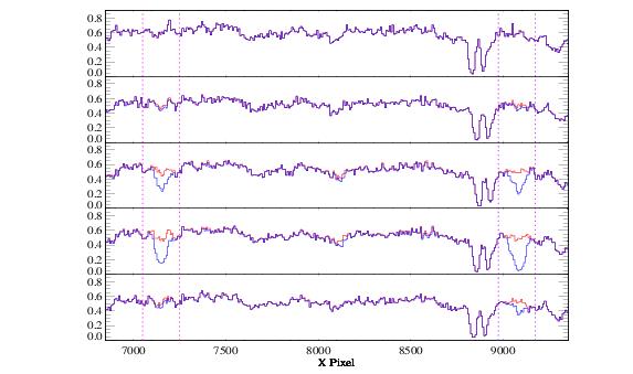 Spectra (G160M/1623/FP-POS=4) of a target observed five times over 19 months: from top to bottom, September 2009, June 2010, September 2010, January 2011, and May 2011. The blue curve includes only photon events with pulse heights in the range 4–30; the red curve includes pulse heights 2–30. The spectral features near pixels 7200 and 9011 are not astrophysical, but represent the effect of gain sag on regions of the detector illuminated by Lyman α in other observing modes. These features become more pronounced with time until March 2011, when the Segment B high voltage was raised.