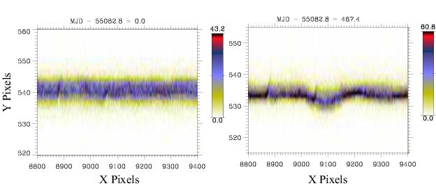 Two-dimensional spectra, uncorrected for walk, taken in September 2009 (left) and December 2010 (right). The entire spectrum has shifted down by several pixels due to gain sag and detector walk. A larger shift is seen in the region near X = 9100, where the gain sag is greater due to the geocoronal Lyman-α feature that falls there when the G130M/1291 when the FP-POS=3 setting is used.