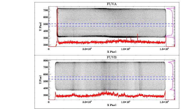 The FUV channel creates one spectral stripe on each detector segment for the science spectrum and another for the wavelength-calibration spectrum. The aperture not being used for science may also create a spectrum. If so, it will appear below the science spectrum if the PSA is being used, and above it if the target is in the BOA. Since the non-target aperture is usually observing blank sky, it will normally be visible only if airglow lines fall in the spectral range. Figure 4.3 shows an example of an FUV spectrum obtained on orbit with Segment B. The upper panel shows the two-dimensional image; the lower panel shows the extracted PSA spectrum. Note the difference in the x- and y-axis scales in the upper figure.
