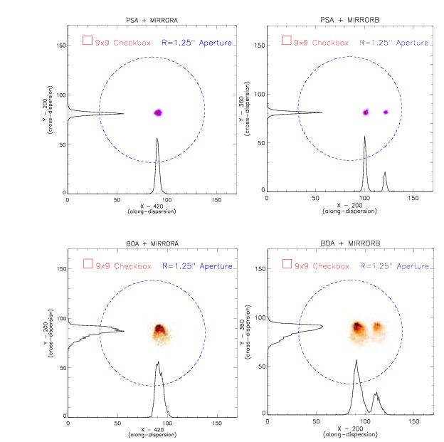 In ACQ/IMAGE mode COS obtains an NUV image of the target field, moves the telescope to center the object, and obtains a second NUV image as confirmation. ACQ/IMAGE may use either the primary science aperture (PSA) or the bright object aperture (BOA) and either MIRRORA or MIRRORB. All four combinations are illustrated in Figure 8.2. Acquisition images obtained through the PSA should strive for a minimum S/N of 20. Due to the complex shape of images obtained through the BOA, S/N > 30 is recommended. (These thresholds were reduced beginning in Cycle 25.) Note the additional structures present in images obtained with MIRRORB or the BOA: The secondary image produced by MIRRORB is half the intensity of the primary image and is displaced by 20 pixels (about 0.5 arcsec) in the along-dispersion direction. The BOA produces a chevron-like image whose peak is displaced in both the along-dispersion (AD) and cross-dispersion (XD) directions. When the BOA is used with MIRRORB, two distorted peaks result. In this configuration, there is some overlap between the wings of the primary and secondary peaks, but they are well enough separated to allow for reliable acquisitions. The lamp and target images of MIRRORA and MIRRORB images are offset and vary from exposure to exposure. Users should expect MIRRORB images to be offset from MIRRORA images by ~214 pixels in AD and ~160 pixels in XD.