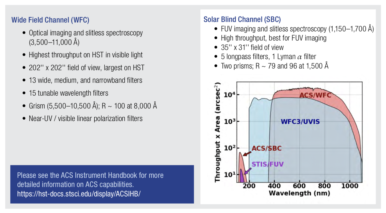 ACS has two cameras: the Wide Field Camera (WFC) operating in the visible between 3500 to 11000 A, and the Solar Blind Channel (SBC) operating in the UV between 1150 and 1700 A.