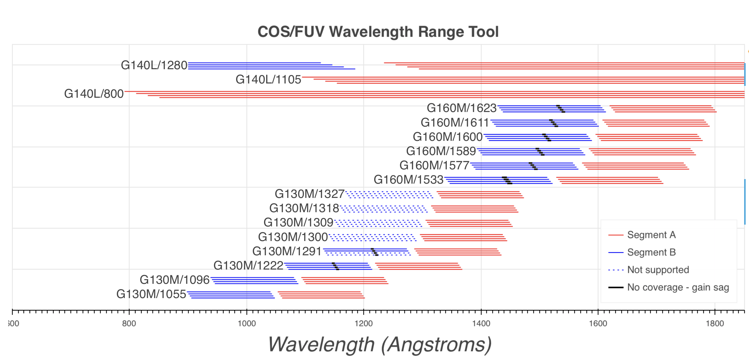 COS works exclusively in the UV and provides low to medium resolution spectroscopy from 800 to 3200 A.