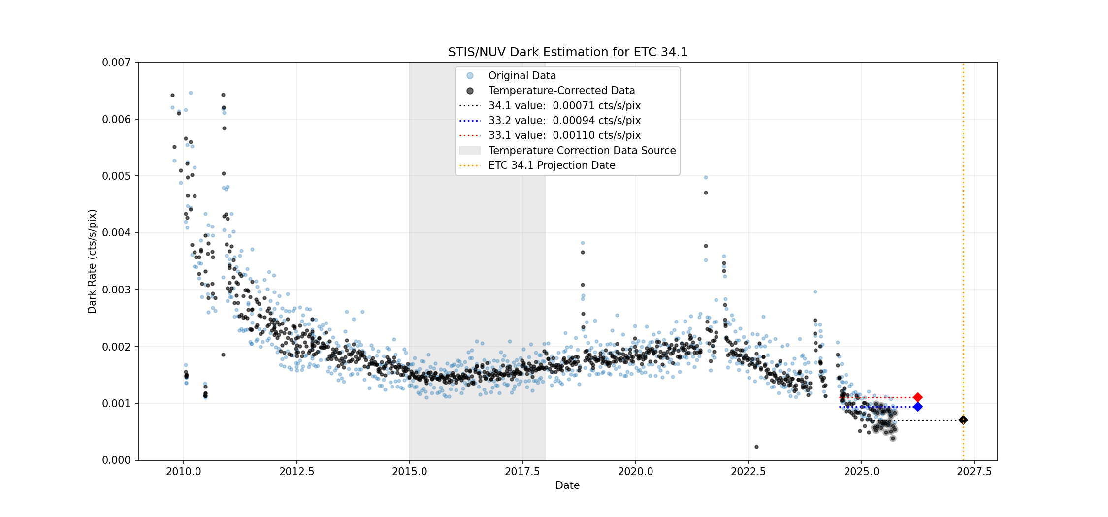 For NUV-MAMA data obtained after SM4, an updated relation has been derived to account for both long-term and short-term variations (see STIS ISR 2013-01 for details). The average dark count rate at a given date and detector temperature is estimated as